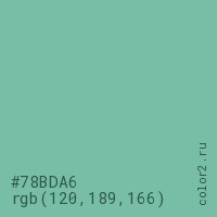 Цвет #78BDA6 в цветовой модели RGB обозначается тремя октетами (120, 189, 166) в десятичном формате и #78BDA6 в шестнадцатиричном (hex) формате, которые являются интенсивностью красного 120 (hex 78), интенсивность зелёного 189 (hex BD) и интенсивность синего 166 (hex A6).