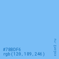 Цвет #78BDF6 в цветовой модели RGB обозначается тремя октетами (120, 189, 246) в десятичном формате и #78BDF6 в шестнадцатиричном (hex) формате, которые являются интенсивностью красного 120 (hex 78), интенсивность зелёного 189 (hex BD) и интенсивность синего 246 (hex F6).