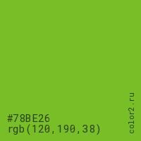 Цвет #78BE26 в цветовой модели RGB обозначается тремя октетами (120, 190, 38) в десятичном формате и #78BE26 в шестнадцатиричном (hex) формате, которые являются интенсивностью красного 120 (hex 78), интенсивность зелёного 190 (hex BE) и интенсивность синего 38 (hex 26).