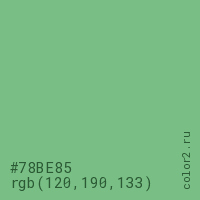 Цвет #78BE85 в цветовой модели RGB обозначается тремя октетами (120, 190, 133) в десятичном формате и #78BE85 в шестнадцатиричном (hex) формате, которые являются интенсивностью красного 120 (hex 78), интенсивность зелёного 190 (hex BE) и интенсивность синего 133 (hex 85).