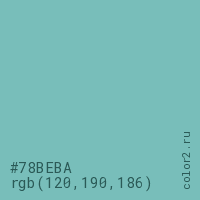 Цвет #78BEBA в цветовой модели RGB обозначается тремя октетами (120, 190, 186) в десятичном формате и #78BEBA в шестнадцатиричном (hex) формате, которые являются интенсивностью красного 120 (hex 78), интенсивность зелёного 190 (hex BE) и интенсивность синего 186 (hex BA).