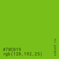 Цвет #78C019 в цветовой модели RGB обозначается тремя октетами (120, 192, 25) в десятичном формате и #78C019 в шестнадцатиричном (hex) формате, которые являются интенсивностью красного 120 (hex 78), интенсивность зелёного 192 (hex C0) и интенсивность синего 25 (hex 19).