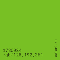 Цвет #78C024 в цветовой модели RGB обозначается тремя октетами (120, 192, 36) в десятичном формате и #78C024 в шестнадцатиричном (hex) формате, которые являются интенсивностью красного 120 (hex 78), интенсивность зелёного 192 (hex C0) и интенсивность синего 36 (hex 24).