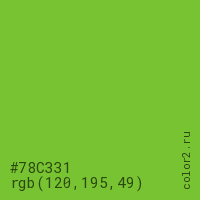 Цвет #78C331 в цветовой модели RGB обозначается тремя октетами (120, 195, 49) в десятичном формате и #78C331 в шестнадцатиричном (hex) формате, которые являются интенсивностью красного 120 (hex 78), интенсивность зелёного 195 (hex C3) и интенсивность синего 49 (hex 31).