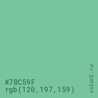 Цвет #78C59F в цветовой модели RGB обозначается тремя октетами (120, 197, 159) в десятичном формате и #78C59F в шестнадцатиричном (hex) формате, которые являются интенсивностью красного 120 (hex 78), интенсивность зелёного 197 (hex C5) и интенсивность синего 159 (hex 9F).