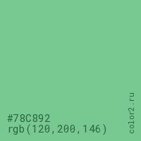 Цвет #78C892 в цветовой модели RGB обозначается тремя октетами (120, 200, 146) в десятичном формате и #78C892 в шестнадцатиричном (hex) формате, которые являются интенсивностью красного 120 (hex 78), интенсивность зелёного 200 (hex C8) и интенсивность синего 146 (hex 92).