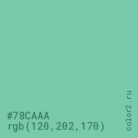 Цвет #78CAAA в цветовой модели RGB обозначается тремя октетами (120, 202, 170) в десятичном формате и #78CAAA в шестнадцатиричном (hex) формате, которые являются интенсивностью красного 120 (hex 78), интенсивность зелёного 202 (hex CA) и интенсивность синего 170 (hex AA).