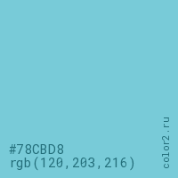 Цвет #78CBD8 в цветовой модели RGB обозначается тремя октетами (120, 203, 216) в десятичном формате и #78CBD8 в шестнадцатиричном (hex) формате, которые являются интенсивностью красного 120 (hex 78), интенсивность зелёного 203 (hex CB) и интенсивность синего 216 (hex D8).