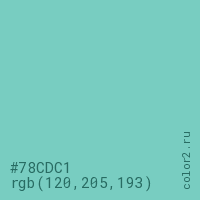 Цвет #78CDC1 в цветовой модели RGB обозначается тремя октетами (120, 205, 193) в десятичном формате и #78CDC1 в шестнадцатиричном (hex) формате, которые являются интенсивностью красного 120 (hex 78), интенсивность зелёного 205 (hex CD) и интенсивность синего 193 (hex C1).