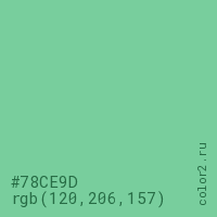 Цвет #78CE9D в цветовой модели RGB обозначается тремя октетами (120, 206, 157) в десятичном формате и #78CE9D в шестнадцатиричном (hex) формате, которые являются интенсивностью красного 120 (hex 78), интенсивность зелёного 206 (hex CE) и интенсивность синего 157 (hex 9D).