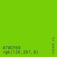 Цвет #78CF08 в цветовой модели RGB обозначается тремя октетами (120, 207, 8) в десятичном формате и #78CF08 в шестнадцатиричном (hex) формате, которые являются интенсивностью красного 120 (hex 78), интенсивность зелёного 207 (hex CF) и интенсивность синего 8 (hex 08).