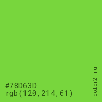 Цвет #78D63D в цветовой модели RGB обозначается тремя октетами (120, 214, 61) в десятичном формате и #78D63D в шестнадцатиричном (hex) формате, которые являются интенсивностью красного 120 (hex 78), интенсивность зелёного 214 (hex D6) и интенсивность синего 61 (hex 3D).