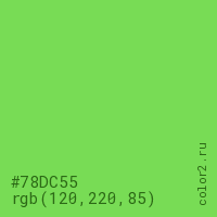 Цвет #78DC55 в цветовой модели RGB обозначается тремя октетами (120, 220, 85) в десятичном формате и #78DC55 в шестнадцатиричном (hex) формате, которые являются интенсивностью красного 120 (hex 78), интенсивность зелёного 220 (hex DC) и интенсивность синего 85 (hex 55).
