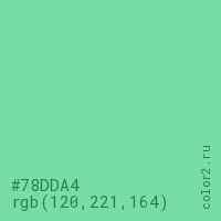 Цвет #78DDA4 в цветовой модели RGB обозначается тремя октетами (120, 221, 164) в десятичном формате и #78DDA4 в шестнадцатиричном (hex) формате, которые являются интенсивностью красного 120 (hex 78), интенсивность зелёного 221 (hex DD) и интенсивность синего 164 (hex A4).