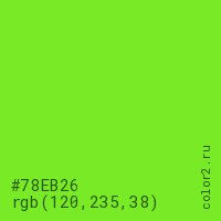 Цвет #78EB26 в цветовой модели RGB обозначается тремя октетами (120, 235, 38) в десятичном формате и #78EB26 в шестнадцатиричном (hex) формате, которые являются интенсивностью красного 120 (hex 78), интенсивность зелёного 235 (hex EB) и интенсивность синего 38 (hex 26).