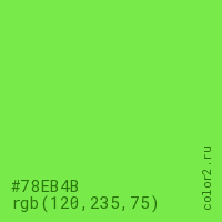 Цвет #78EB4B в цветовой модели RGB обозначается тремя октетами (120, 235, 75) в десятичном формате и #78EB4B в шестнадцатиричном (hex) формате, которые являются интенсивностью красного 120 (hex 78), интенсивность зелёного 235 (hex EB) и интенсивность синего 75 (hex 4B).
