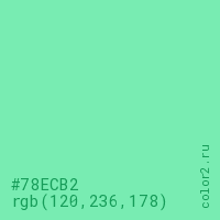 Цвет #78ECB2 в цветовой модели RGB обозначается тремя октетами (120, 236, 178) в десятичном формате и #78ECB2 в шестнадцатиричном (hex) формате, которые являются интенсивностью красного 120 (hex 78), интенсивность зелёного 236 (hex EC) и интенсивность синего 178 (hex B2).