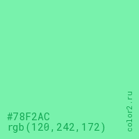 Цвет #78F2AC в цветовой модели RGB обозначается тремя октетами (120, 242, 172) в десятичном формате и #78F2AC в шестнадцатиричном (hex) формате, которые являются интенсивностью красного 120 (hex 78), интенсивность зелёного 242 (hex F2) и интенсивность синего 172 (hex AC).