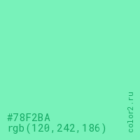 Цвет #78F2BA в цветовой модели RGB обозначается тремя октетами (120, 242, 186) в десятичном формате и #78F2BA в шестнадцатиричном (hex) формате, которые являются интенсивностью красного 120 (hex 78), интенсивность зелёного 242 (hex F2) и интенсивность синего 186 (hex BA).