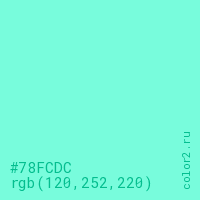 Цвет #78FCDC в цветовой модели RGB обозначается тремя октетами (120, 252, 220) в десятичном формате и #78FCDC в шестнадцатиричном (hex) формате, которые являются интенсивностью красного 120 (hex 78), интенсивность зелёного 252 (hex FC) и интенсивность синего 220 (hex DC).