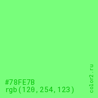 Цвет #78FE7B в цветовой модели RGB обозначается тремя октетами (120, 254, 123) в десятичном формате и #78FE7B в шестнадцатиричном (hex) формате, которые являются интенсивностью красного 120 (hex 78), интенсивность зелёного 254 (hex FE) и интенсивность синего 123 (hex 7B).