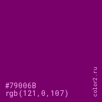 Цвет #79006B в цветовой модели RGB обозначается тремя октетами (121, 0, 107) в десятичном формате и #79006B в шестнадцатиричном (hex) формате, которые являются интенсивностью красного 121 (hex 79), интенсивность зелёного 0 (hex 00) и интенсивность синего 107 (hex 6B).