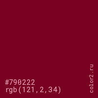 Цвет #790222 в цветовой модели RGB обозначается тремя октетами (121, 2, 34) в десятичном формате и #790222 в шестнадцатиричном (hex) формате, которые являются интенсивностью красного 121 (hex 79), интенсивность зелёного 2 (hex 02) и интенсивность синего 34 (hex 22).