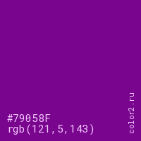 Цвет #79058F в цветовой модели RGB обозначается тремя октетами (121, 5, 143) в десятичном формате и #79058F в шестнадцатиричном (hex) формате, которые являются интенсивностью красного 121 (hex 79), интенсивность зелёного 5 (hex 05) и интенсивность синего 143 (hex 8F).