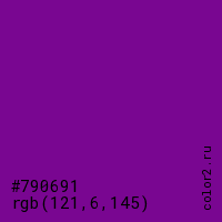 Цвет #790691 в цветовой модели RGB обозначается тремя октетами (121, 6, 145) в десятичном формате и #790691 в шестнадцатиричном (hex) формате, которые являются интенсивностью красного 121 (hex 79), интенсивность зелёного 6 (hex 06) и интенсивность синего 145 (hex 91).