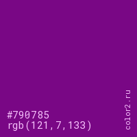 Цвет #790785 в цветовой модели RGB обозначается тремя октетами (121, 7, 133) в десятичном формате и #790785 в шестнадцатиричном (hex) формате, которые являются интенсивностью красного 121 (hex 79), интенсивность зелёного 7 (hex 07) и интенсивность синего 133 (hex 85).