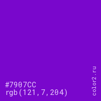 Цвет #7907CC в цветовой модели RGB обозначается тремя октетами (121, 7, 204) в десятичном формате и #7907CC в шестнадцатиричном (hex) формате, которые являются интенсивностью красного 121 (hex 79), интенсивность зелёного 7 (hex 07) и интенсивность синего 204 (hex CC).