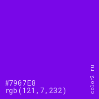 Цвет #7907E8 в цветовой модели RGB обозначается тремя октетами (121, 7, 232) в десятичном формате и #7907E8 в шестнадцатиричном (hex) формате, которые являются интенсивностью красного 121 (hex 79), интенсивность зелёного 7 (hex 07) и интенсивность синего 232 (hex E8).