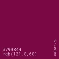 Цвет #790844 в цветовой модели RGB обозначается тремя октетами (121, 8, 68) в десятичном формате и #790844 в шестнадцатиричном (hex) формате, которые являются интенсивностью красного 121 (hex 79), интенсивность зелёного 8 (hex 08) и интенсивность синего 68 (hex 44).