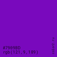 Цвет #7909BD в цветовой модели RGB обозначается тремя октетами (121, 9, 189) в десятичном формате и #7909BD в шестнадцатиричном (hex) формате, которые являются интенсивностью красного 121 (hex 79), интенсивность зелёного 9 (hex 09) и интенсивность синего 189 (hex BD).