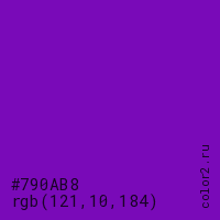 Цвет #790AB8 в цветовой модели RGB обозначается тремя октетами (121, 10, 184) в десятичном формате и #790AB8 в шестнадцатиричном (hex) формате, которые являются интенсивностью красного 121 (hex 79), интенсивность зелёного 10 (hex 0A) и интенсивность синего 184 (hex B8).