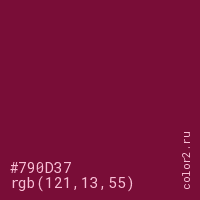 Цвет #790D37 в цветовой модели RGB обозначается тремя октетами (121, 13, 55) в десятичном формате и #790D37 в шестнадцатиричном (hex) формате, которые являются интенсивностью красного 121 (hex 79), интенсивность зелёного 13 (hex 0D) и интенсивность синего 55 (hex 37).