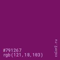 Цвет #791267 в цветовой модели RGB обозначается тремя октетами (121, 18, 103) в десятичном формате и #791267 в шестнадцатиричном (hex) формате, которые являются интенсивностью красного 121 (hex 79), интенсивность зелёного 18 (hex 12) и интенсивность синего 103 (hex 67).