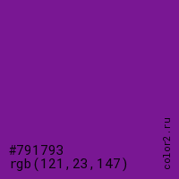 Цвет #791793 в цветовой модели RGB обозначается тремя октетами (121, 23, 147) в десятичном формате и #791793 в шестнадцатиричном (hex) формате, которые являются интенсивностью красного 121 (hex 79), интенсивность зелёного 23 (hex 17) и интенсивность синего 147 (hex 93).