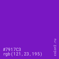 Цвет #7917C3 в цветовой модели RGB обозначается тремя октетами (121, 23, 195) в десятичном формате и #7917C3 в шестнадцатиричном (hex) формате, которые являются интенсивностью красного 121 (hex 79), интенсивность зелёного 23 (hex 17) и интенсивность синего 195 (hex C3).