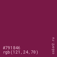Цвет #791846 в цветовой модели RGB обозначается тремя октетами (121, 24, 70) в десятичном формате и #791846 в шестнадцатиричном (hex) формате, которые являются интенсивностью красного 121 (hex 79), интенсивность зелёного 24 (hex 18) и интенсивность синего 70 (hex 46).