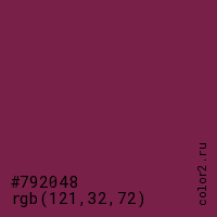 Цвет #792048 в цветовой модели RGB обозначается тремя октетами (121, 32, 72) в десятичном формате и #792048 в шестнадцатиричном (hex) формате, которые являются интенсивностью красного 121 (hex 79), интенсивность зелёного 32 (hex 20) и интенсивность синего 72 (hex 48).