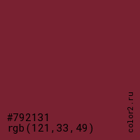 Цвет #792131 в цветовой модели RGB обозначается тремя октетами (121, 33, 49) в десятичном формате и #792131 в шестнадцатиричном (hex) формате, которые являются интенсивностью красного 121 (hex 79), интенсивность зелёного 33 (hex 21) и интенсивность синего 49 (hex 31).