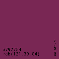 Цвет #792754 в цветовой модели RGB обозначается тремя октетами (121, 39, 84) в десятичном формате и #792754 в шестнадцатиричном (hex) формате, которые являются интенсивностью красного 121 (hex 79), интенсивность зелёного 39 (hex 27) и интенсивность синего 84 (hex 54).