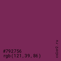 Цвет #792756 в цветовой модели RGB обозначается тремя октетами (121, 39, 86) в десятичном формате и #792756 в шестнадцатиричном (hex) формате, которые являются интенсивностью красного 121 (hex 79), интенсивность зелёного 39 (hex 27) и интенсивность синего 86 (hex 56).