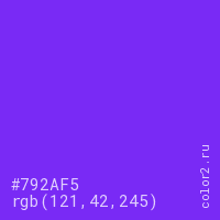 Цвет #792AF5 в цветовой модели RGB обозначается тремя октетами (121, 42, 245) в десятичном формате и #792AF5 в шестнадцатиричном (hex) формате, которые являются интенсивностью красного 121 (hex 79), интенсивность зелёного 42 (hex 2A) и интенсивность синего 245 (hex F5).