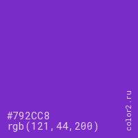 Цвет #792CC8 в цветовой модели RGB обозначается тремя октетами (121, 44, 200) в десятичном формате и #792CC8 в шестнадцатиричном (hex) формате, которые являются интенсивностью красного 121 (hex 79), интенсивность зелёного 44 (hex 2C) и интенсивность синего 200 (hex C8).