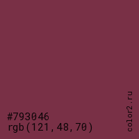 Цвет #793046 в цветовой модели RGB обозначается тремя октетами (121, 48, 70) в десятичном формате и #793046 в шестнадцатиричном (hex) формате, которые являются интенсивностью красного 121 (hex 79), интенсивность зелёного 48 (hex 30) и интенсивность синего 70 (hex 46).