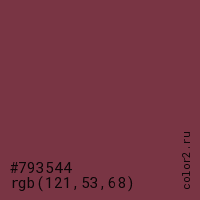 Цвет #793544 в цветовой модели RGB обозначается тремя октетами (121, 53, 68) в десятичном формате и #793544 в шестнадцатиричном (hex) формате, которые являются интенсивностью красного 121 (hex 79), интенсивность зелёного 53 (hex 35) и интенсивность синего 68 (hex 44).