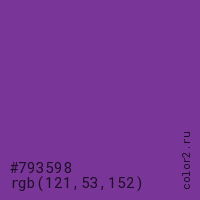 Цвет #793598 в цветовой модели RGB обозначается тремя октетами (121, 53, 152) в десятичном формате и #793598 в шестнадцатиричном (hex) формате, которые являются интенсивностью красного 121 (hex 79), интенсивность зелёного 53 (hex 35) и интенсивность синего 152 (hex 98).