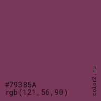 Цвет #79385A в цветовой модели RGB обозначается тремя октетами (121, 56, 90) в десятичном формате и #79385A в шестнадцатиричном (hex) формате, которые являются интенсивностью красного 121 (hex 79), интенсивность зелёного 56 (hex 38) и интенсивность синего 90 (hex 5A).